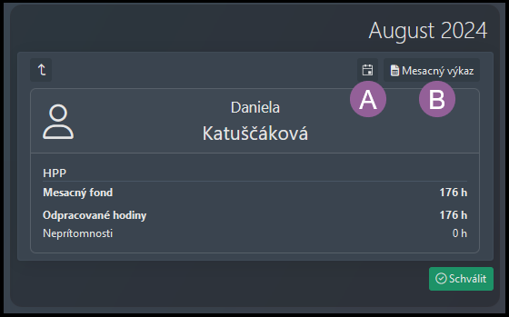 D) Stav – Ikony zobrazujú aktuálny stav zelená=schválené, sivá=neschválené. Napríklad zamestnanec uzavrel mesiac (prvá ikona je zelená), ale manažér mesiac neuzavrel (druhá ikona je sivá). Kliknite na meno zamestnanca alebo stav, aby ste uzavreli jeho/jej mesiac individuálne.