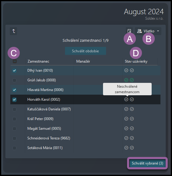 C) Začiarkavacie políčka pre hromadné schvaľovanie – Začiarknite políčko, aby ste vybrali viacerých zamestnancov. Potom kliknite na tlačidlo Schváliť vybrané.