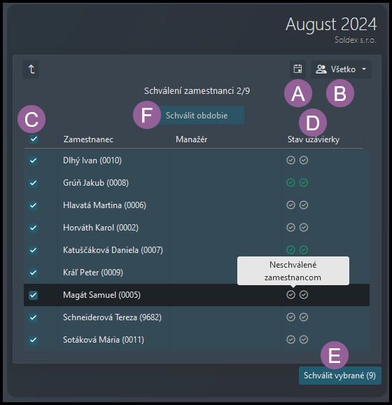 E) Tlačidlo Schváliť vybrané – V prípade, že nie všetci zamestnanci a manažéri uzavreli svoj mesiac, môžete to urobiť za nich. Začiarknite štvorčeky vedľa mien, aby ste vybrali viacerých zamestnancov, a potom kliknite na Schváliť vybrané.